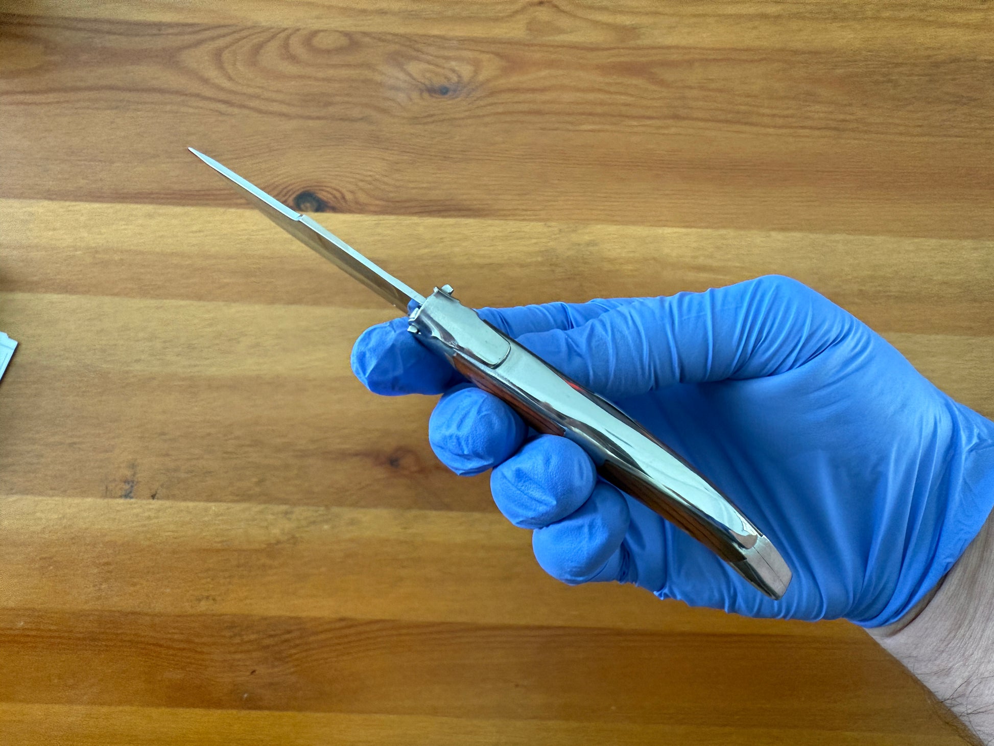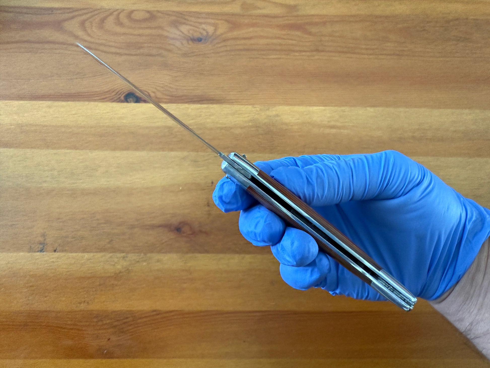Stainless steel blade. Red wood scales. Billet closure. Stainless steel bolsters.