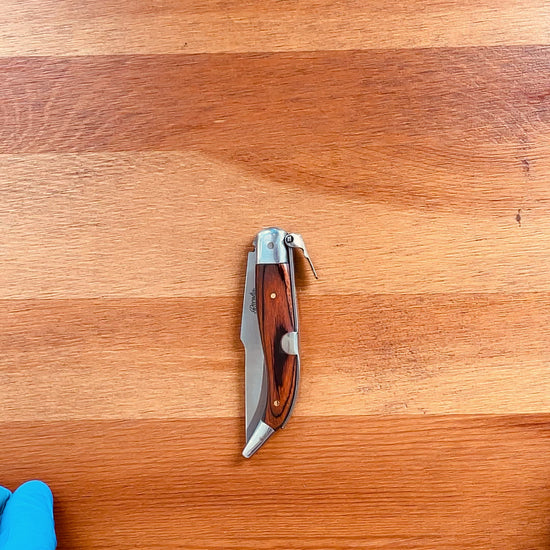 Navaja Clasica de Teja Madera 8 cm. Made in Albacete, Spain. Albaceteña madera. Cachas de madera roja. Palanquilla. Hoja de acero inox. Virola acero inox.