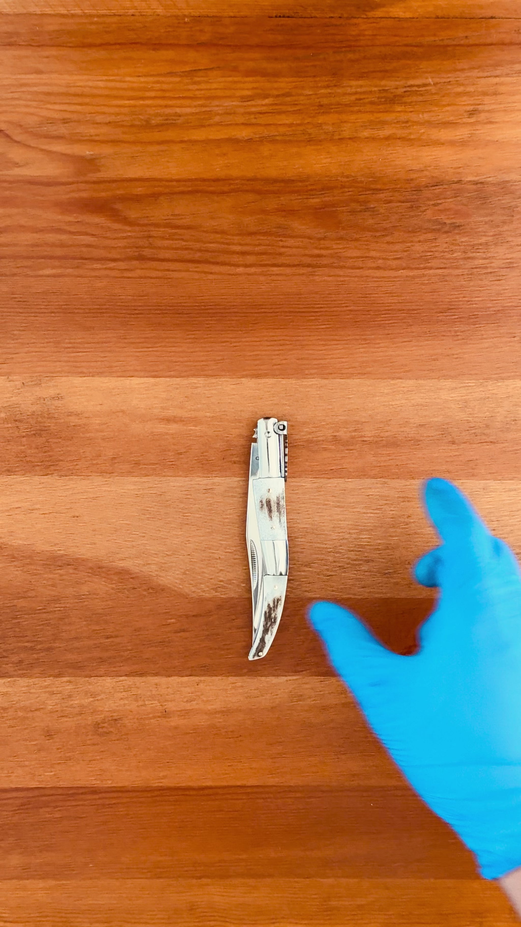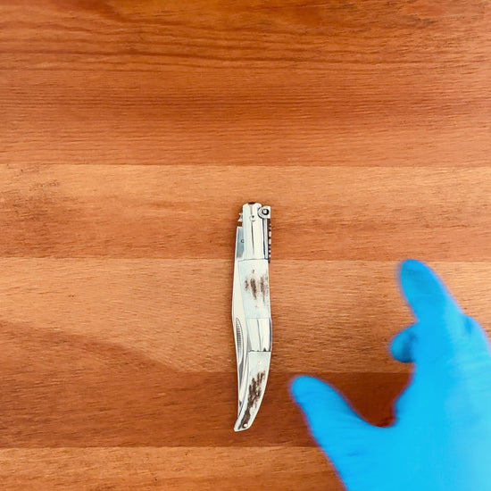 Ratchet knife, crafted with CNC technology. It features mirror-polished stainless steel bolsters combined with authentic stag horn inserts, and an 11 cm (4.33 in) 440 stainless steel blade with a mirror finish. The decorated back spring and lever add a traditional artisanal touch.
