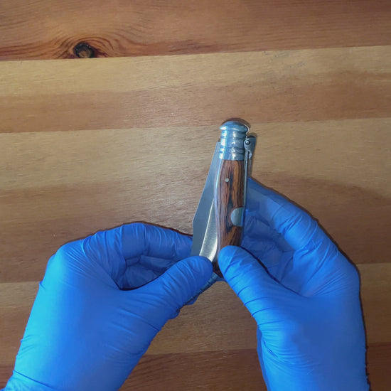 Sevillian style pocket knife. Stainless steel rope with red wood scales. 10 cm blade.