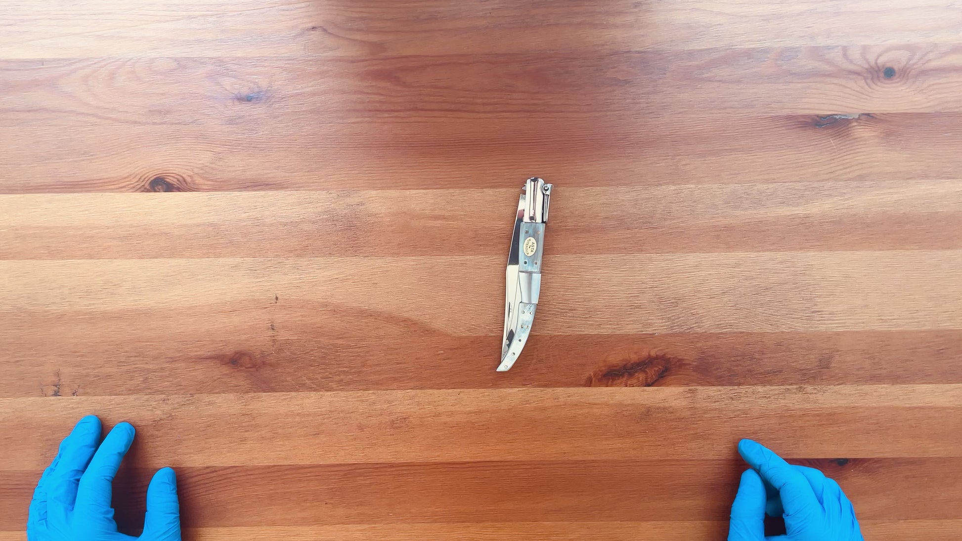 Hoja inoxidable de 13 cm. Virolas inox. Cachas de asta de toro. Cierre de palanquilla.