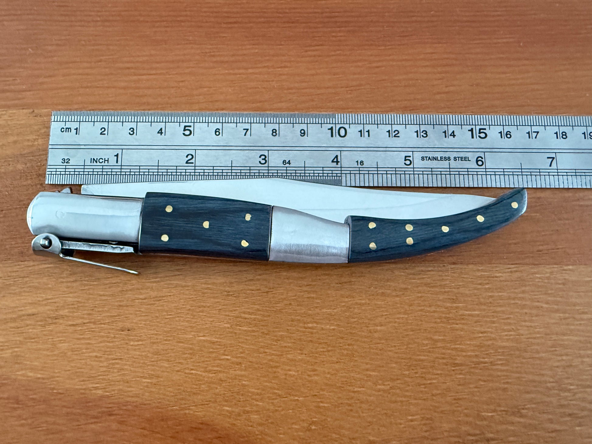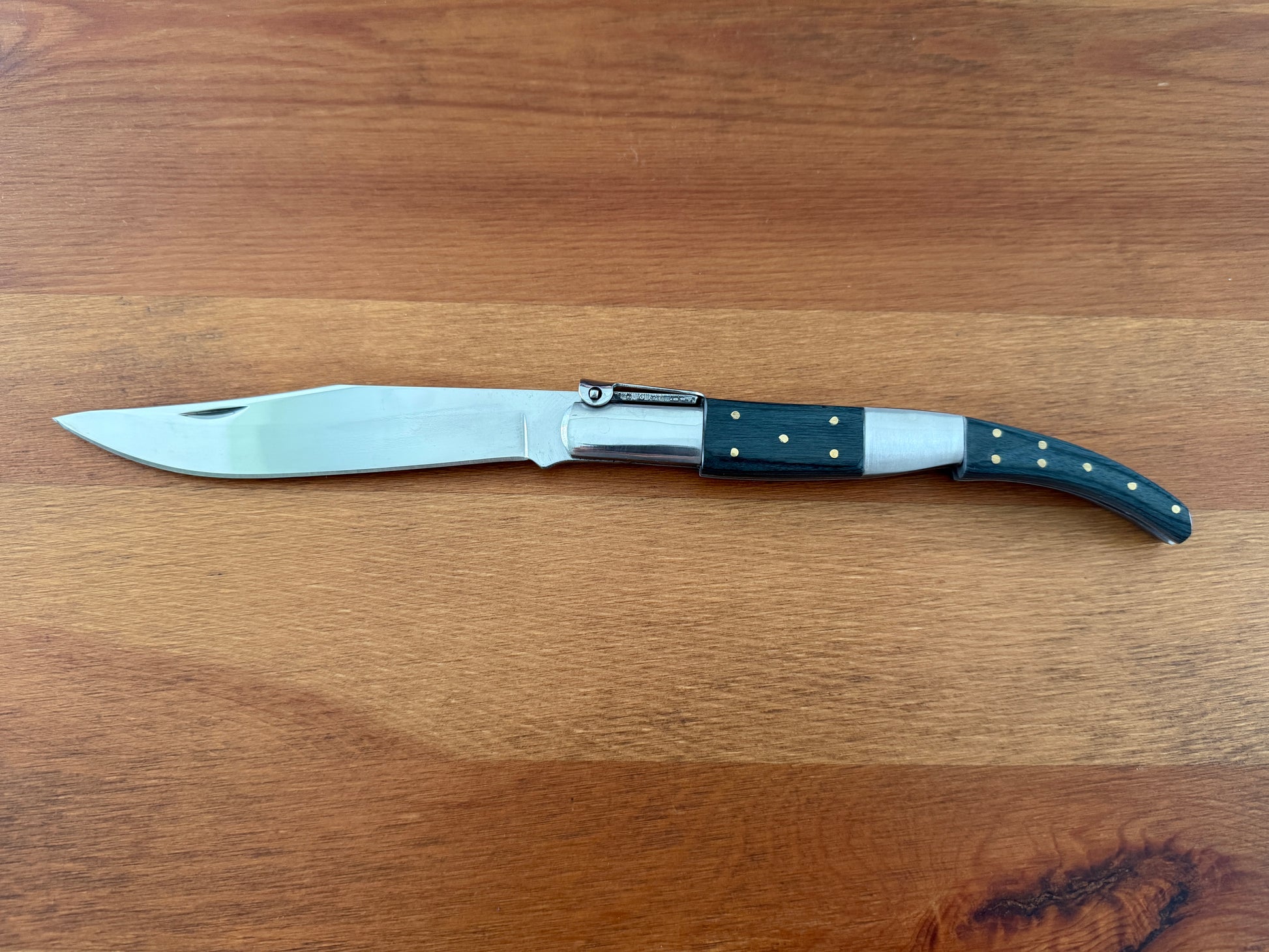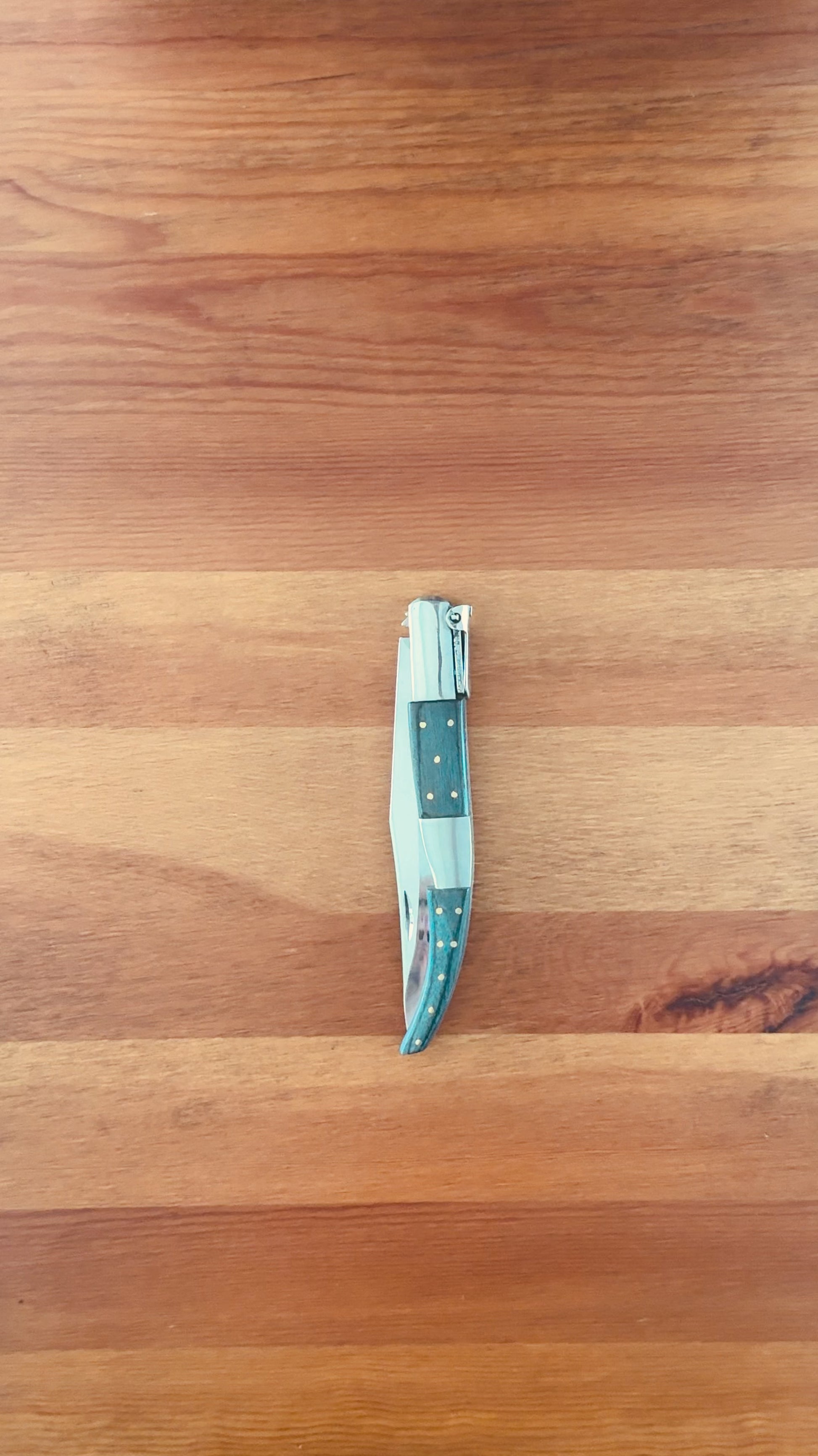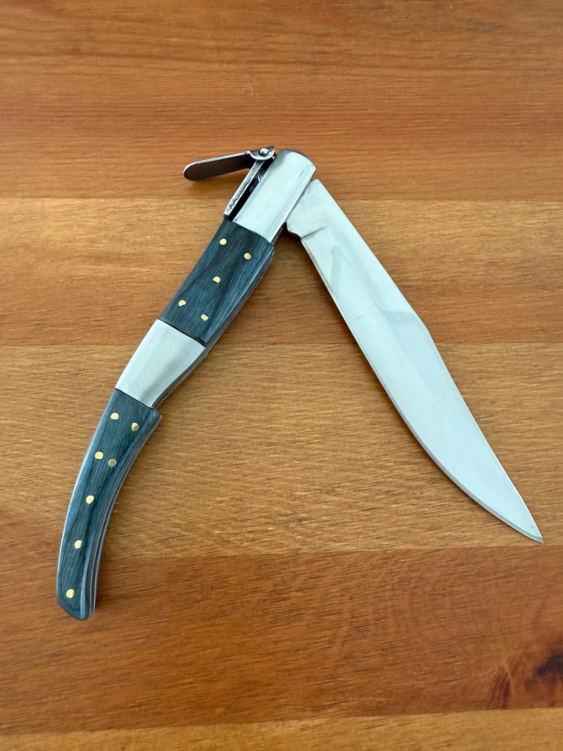 5.3 inch / 13.5 cm stainless steel blade, shiny/mirror finish. Stainless steel bolsters. Blue wood scales. Billet lock. With a ratchet.