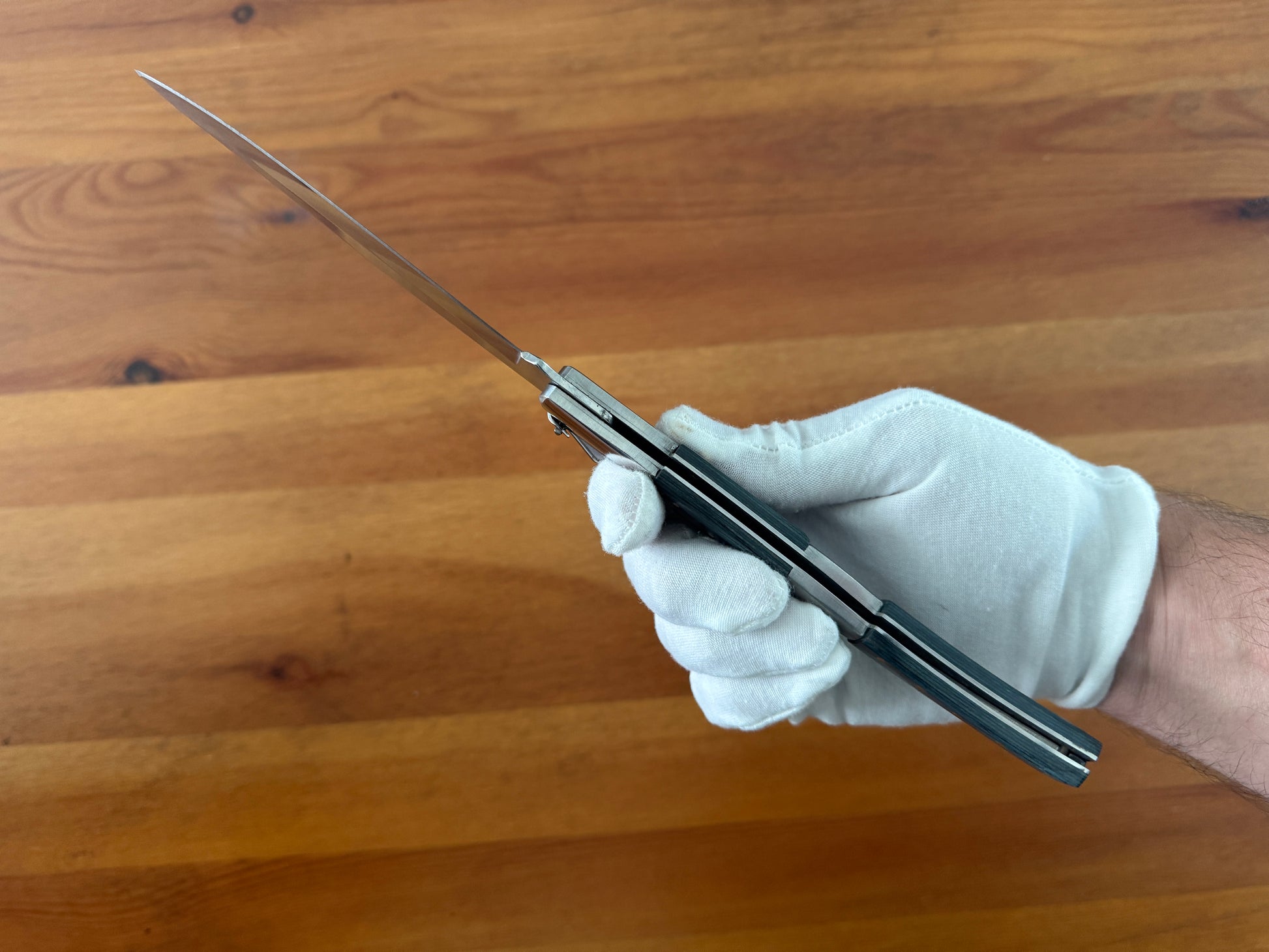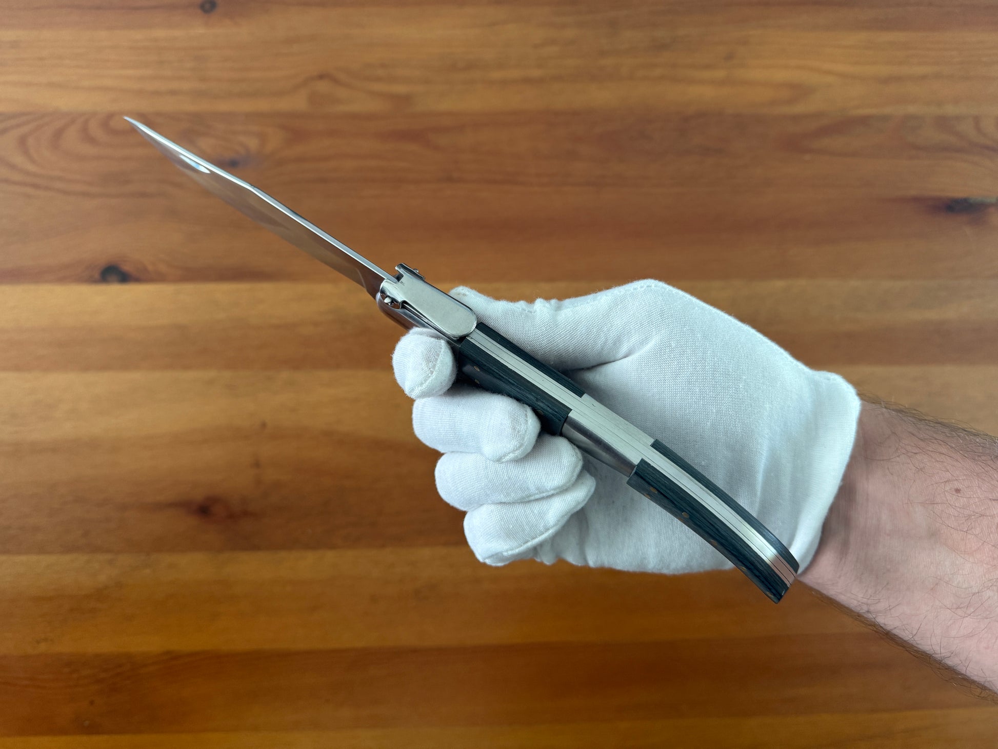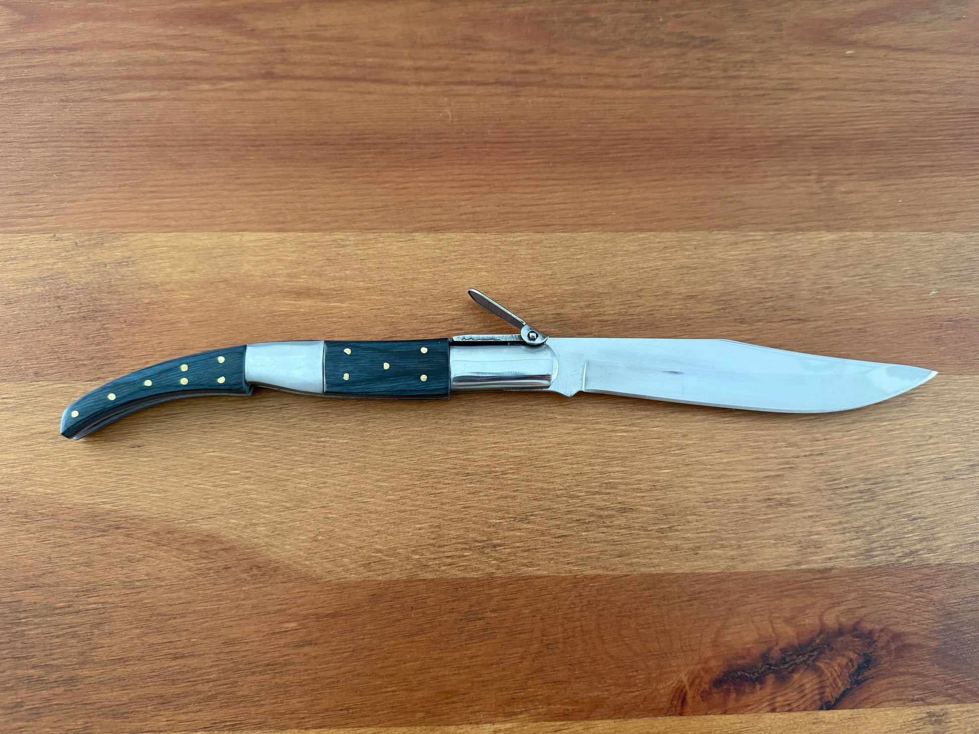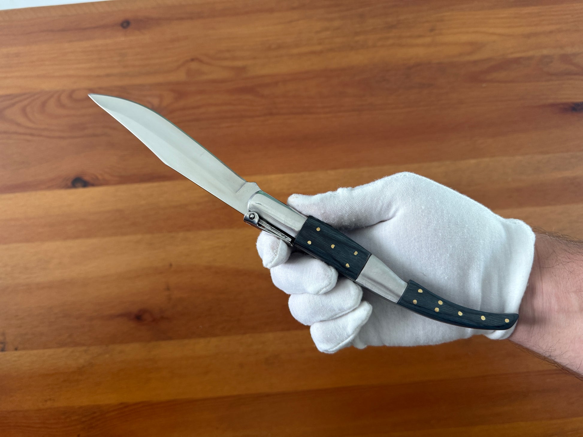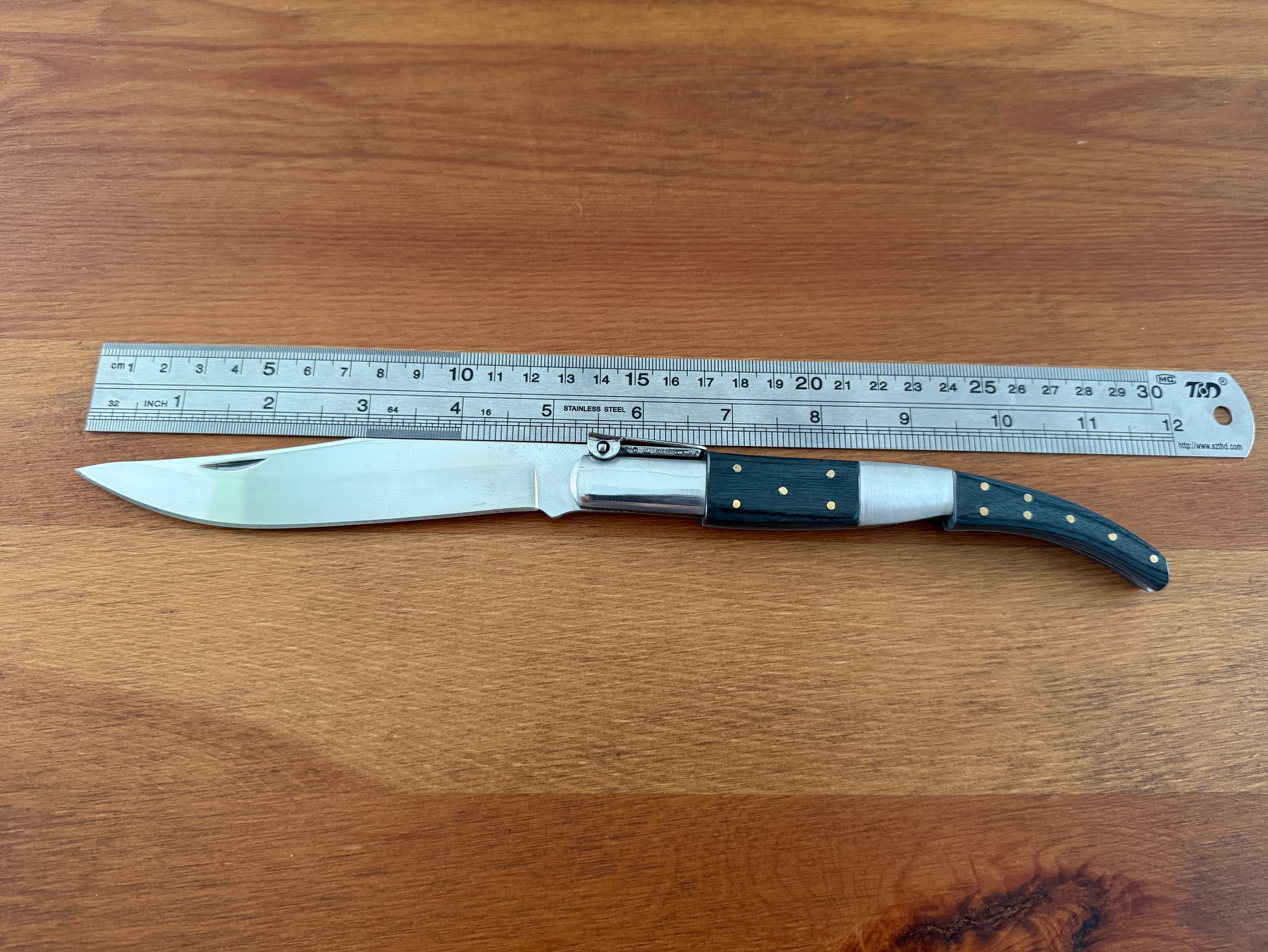 5.3 inch / 13.5 cm stainless steel blade, shiny/mirror finish. Stainless steel bolsters. Blue wood scales. Billet lock. With a ratchet.